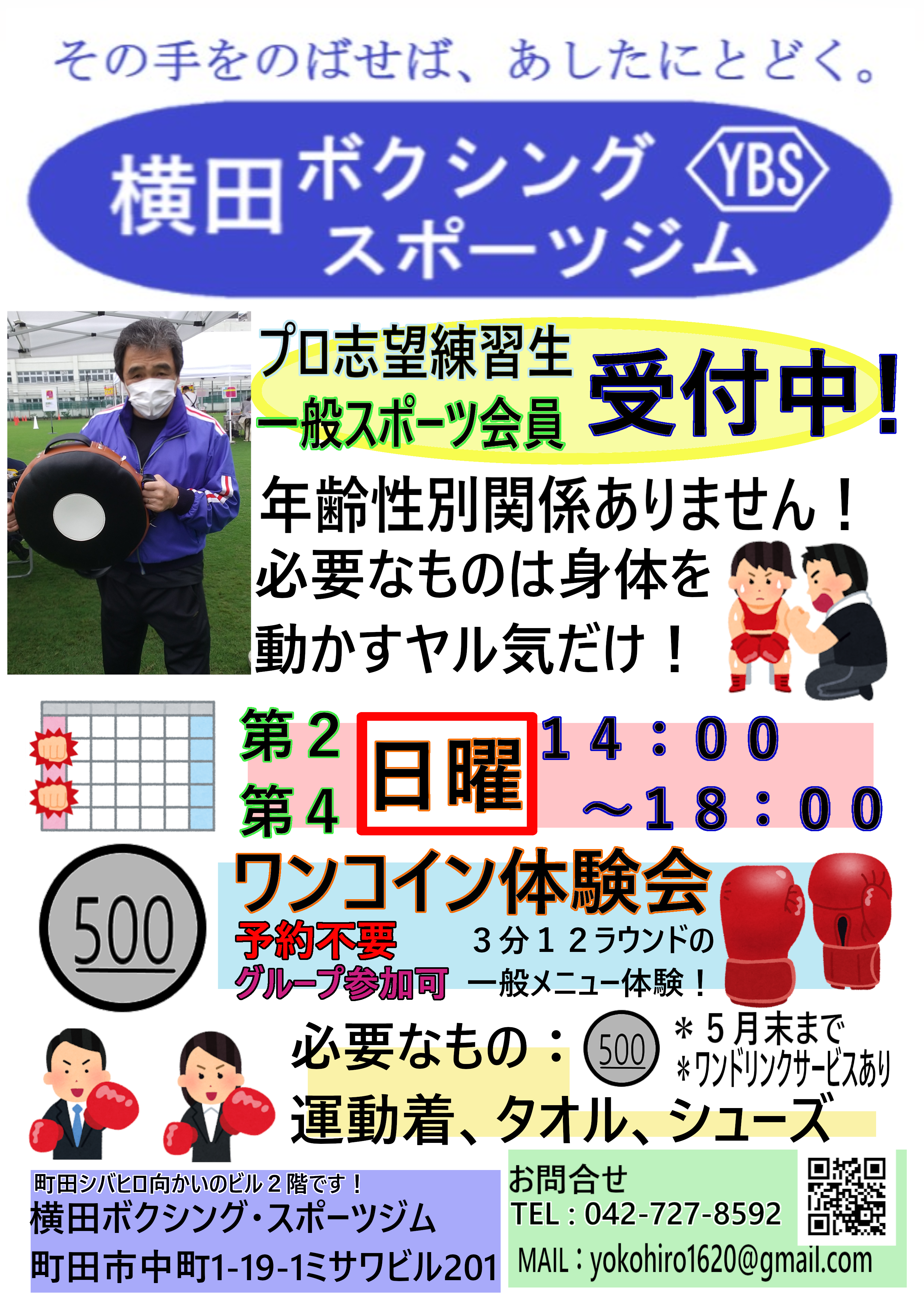 横田ボクシング・スポーツジムの西脇です。 この度、当ジムにて第2第4日曜14時~18時の間で、ボクシング・ワンコイン体験会を開催する事となりました。 本開催は4月からですが、今週26日(日)に関しても体験会は行います。 ストレス、運動不足解消にぜひご参加いただければ幸いです。 時間は一時間程度、ウォーミングアップからシャドウ、サンドバッグ打ちなど、一連の基本メニューを行います。 持ち物は500円、運動着、タオル、シューズ。飲み物は当ジムでもワンドリンク提供致します。 フリータイム制となっておりますので、時間内であれば好きな時間にご参加いただけます。 添付チラシでは5月末までとありますが、好評であれば以降も継続したいとも考えております。 もちろん見学だけでも大歓迎です。 それではお待ちしております。 〒194-0021 東京都町田市中町1-19-1ミサワビル201 横田ボクシング・スポーツジム 担当:西脇 TEL 042-727-8592 FAX 042-727-8591